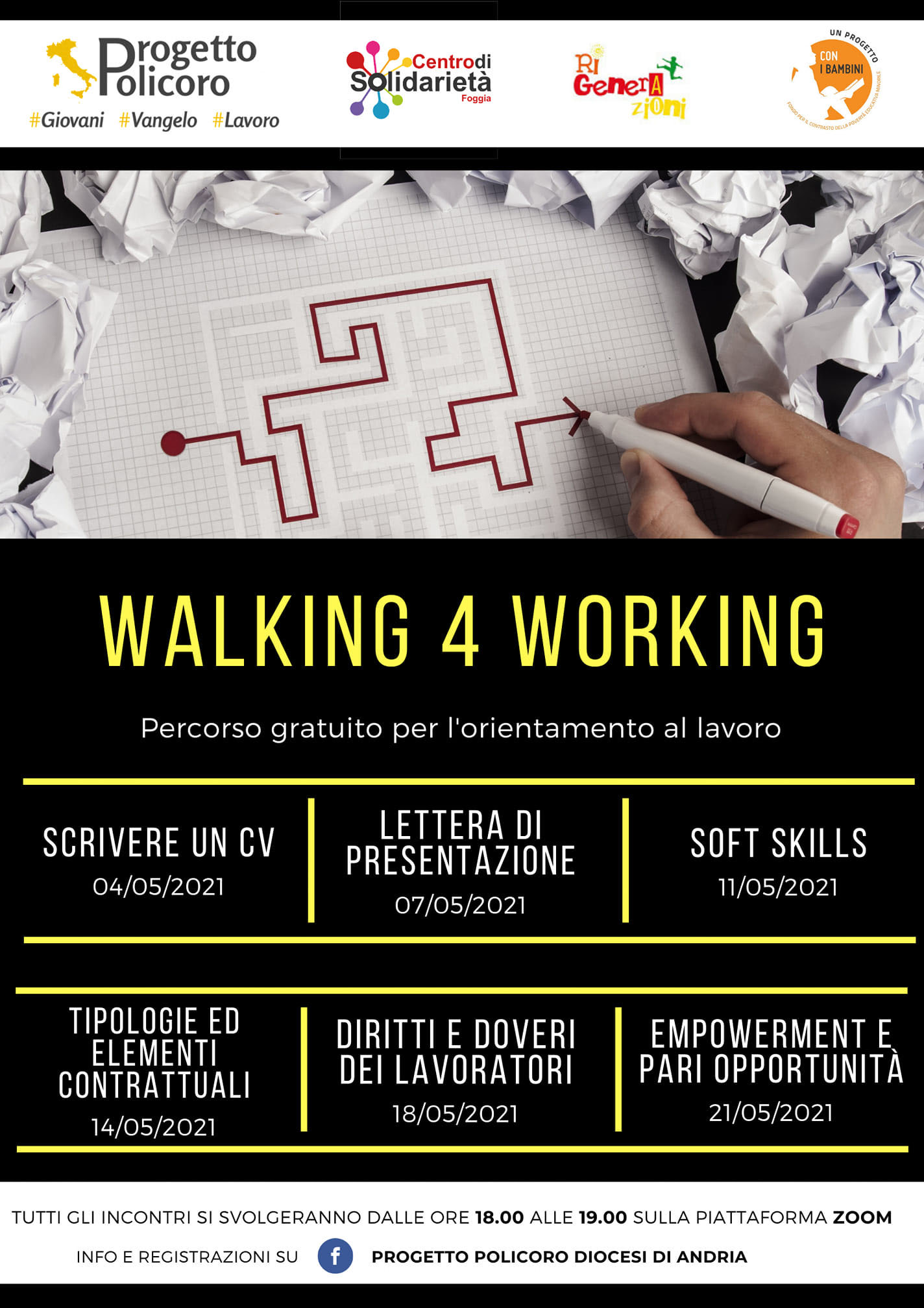 Questo percorso formativo consentirà di acquisire gli strumenti necessari per poter affrontare con maggiore sicurezza e competenza la ricerca occupazionale ed il momento dell’incontro con le aziende. Walking 4 working è promosso e organizzato dal Progetto Policoro della diocesi di Andria, Progetto Policoro della diocesi di Trani e Centro di Solidarietà di Foggia, realizzato nell’ambito del progetto RiGenerAzioni, finanziato dall’impresa sociale Con i bambini.